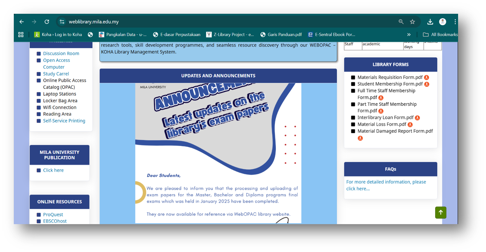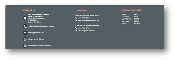 For additional assistance, users may visit the Circulation Counter or contact the library via email at library@mila.edu.my.
