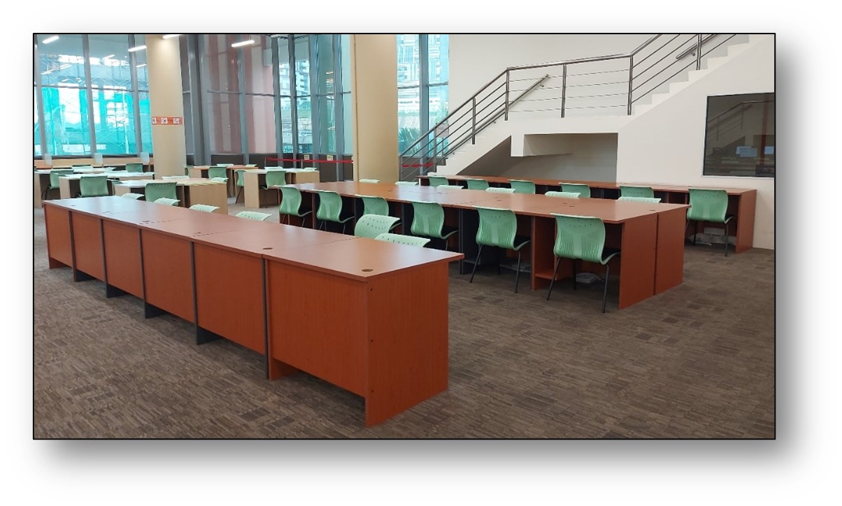 The library offers 24 dedicated laptop stations, each with access to an electrical outlet, allowing users to comfortably work with their personal laptops.